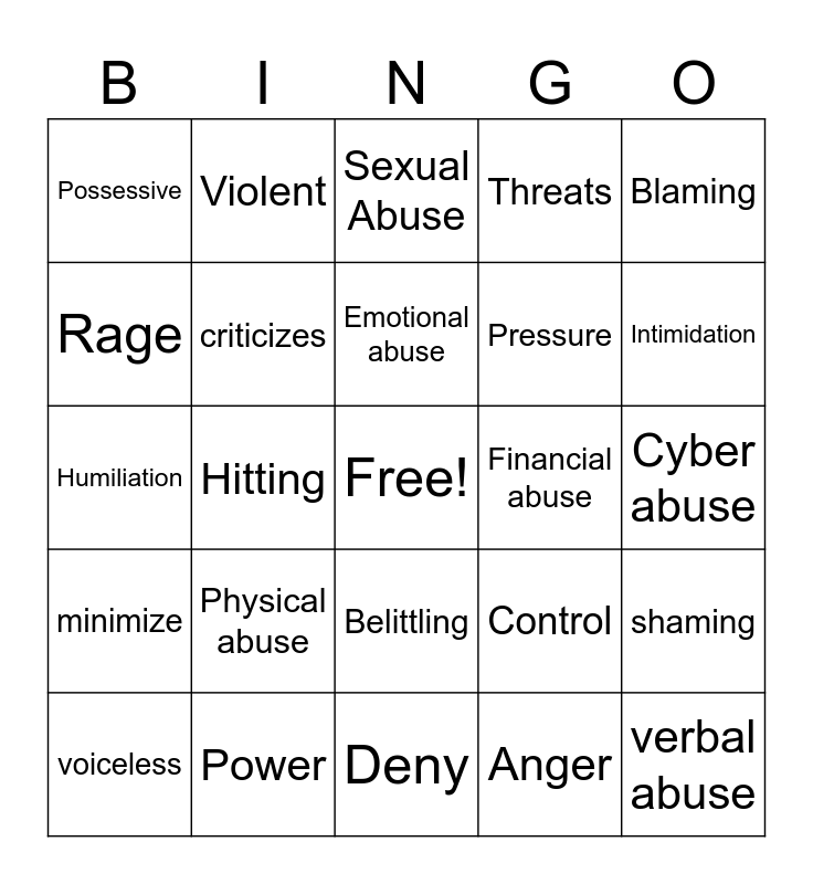 This bingo card has a free space and 24 words: voiceless, Physical abuse, Emotional abuse, Anger, Blaming, Possessive, Violent, Sexual Abuse, Financial abuse, Cyber abuse, Humiliation, criticizes, Control, shaming, Rage, Power, Deny, Threats, Intimidation, minimize, Hitting, Belittling, Pressure and verbal abuse.