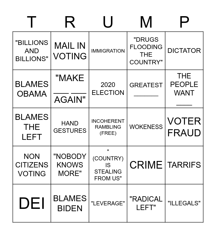 This bingo card has a free space and 24 words: "NOBODY KNOWS MORE", BLAMES BIDEN, 2020 ELECTION, DEI, DICTATOR, "BILLIONS AND BILLIONS", BLAMES OBAMA, MAIL IN VOTING, WOKENESS, "(COUNTRY) IS STEALING FROM US", GREATEST _______, BLAMES THE LEFT, CRIME, TARRIFS, "MAKE ___ ___ AGAIN", "RADICAL LEFT", VOTER FRAUD, IMMIGRATION, THE PEOPLE WANT ____, HAND GESTURES, "ILLEGALS", NON CITIZENS VOTING, "DRUGS FLOODING THE COUNTRY" and "LEVERAGE".