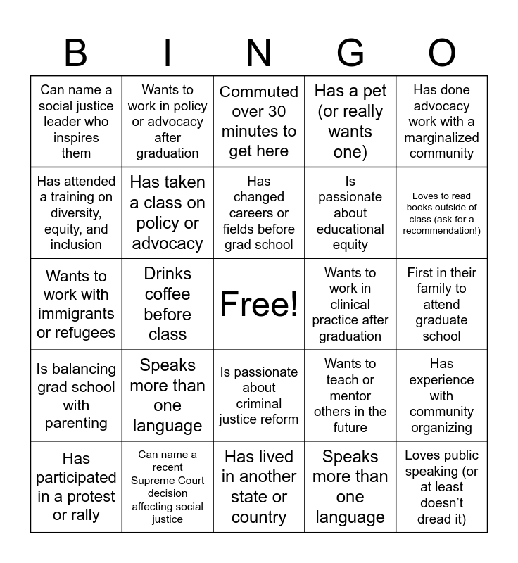 This bingo card has a free space and 24 words: Speaks more than one language, Can name a recent Supreme Court decision affecting social justice, Has changed careers or fields before grad school, Has participated in a protest or rally, Has done advocacy work with a marginalized community, Can name a social justice leader who inspires them, Has attended a training on diversity, equity, and inclusion, Wants to work in policy or advocacy after graduation, Wants to work in clinical practice after graduation, Is passionate about criminal justice reform, Is passionate about educational equity, Wants to work with immigrants or refugees, Wants to teach or mentor others in the future, Has experience with community organizing, Has taken a class on policy or advocacy, Speaks more than one language, First in their family to attend graduate school, Commuted over 30 minutes to get here, Loves to read books outside of class (ask for a recommendation!), Drinks coffee before class, Loves public speaking (or at least doesn’t dread it), Is balancing grad school with parenting, Has a pet (or really wants one) and Has lived in another state or country.