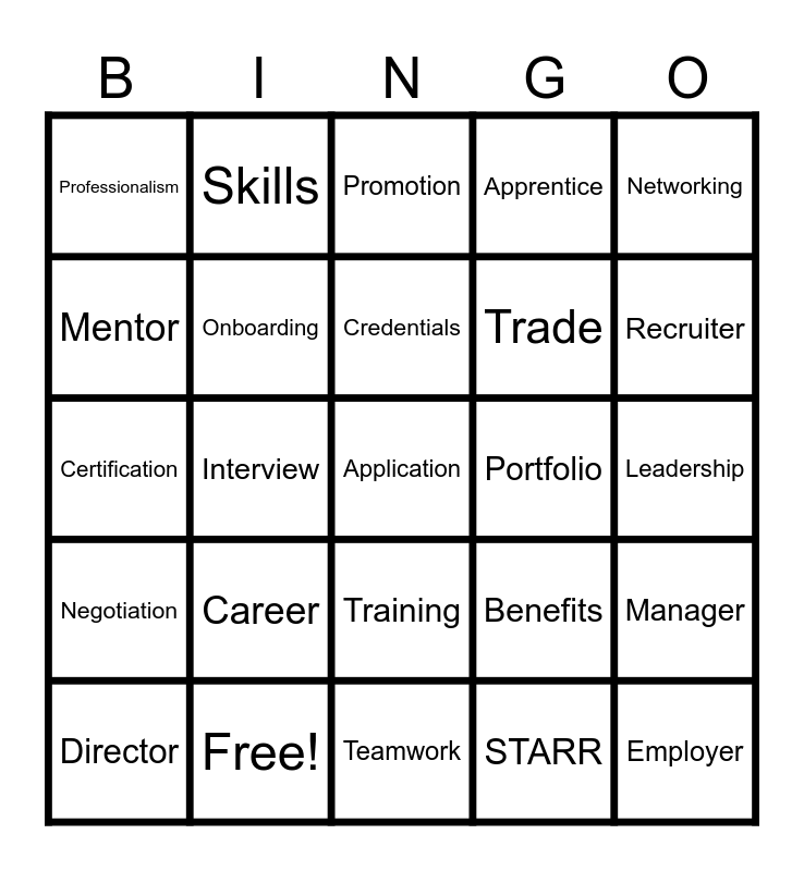 This bingo card has 30 words: Free!, Resume, Interview, Internship, Professionalism, Promotion, Onboarding, Training, Portfolio, Teamwork, Leadership, Application, STARR, Employer, Recruiter, Salary, Benefits, Negotiation, Career, Networking, Certification, Collaboration, Skills, Trade, Mentor, Apprentice, Manager, Director, Credentials and Work Ethic.