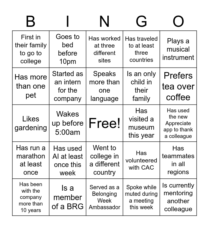 This bingo card has a free space and 24 words: Has used AI at least once this week, Is a member of a BRG, Speaks more than one language, Has been with the company more than 10 years, Plays a musical instrument, First in their family to go to college, Has more than one pet, Goes to bed before 10pm, Has visited a museum this year, Went to college in a different country, Is an only child in their family, Likes gardening, Has volunteered with CAC, Has teammates in all regions, Started as an intern for the company, Spoke while muted during a meeting this week, Has used the new Appreciate app to thank a colleague, Has worked at three different sites, Prefers tea over coffee, Wakes up before 5:00am, Is currently mentoring another colleague, Has run a marathon at least once, Has traveled to at least three countries and Served as a Belonging Week Ambassador.