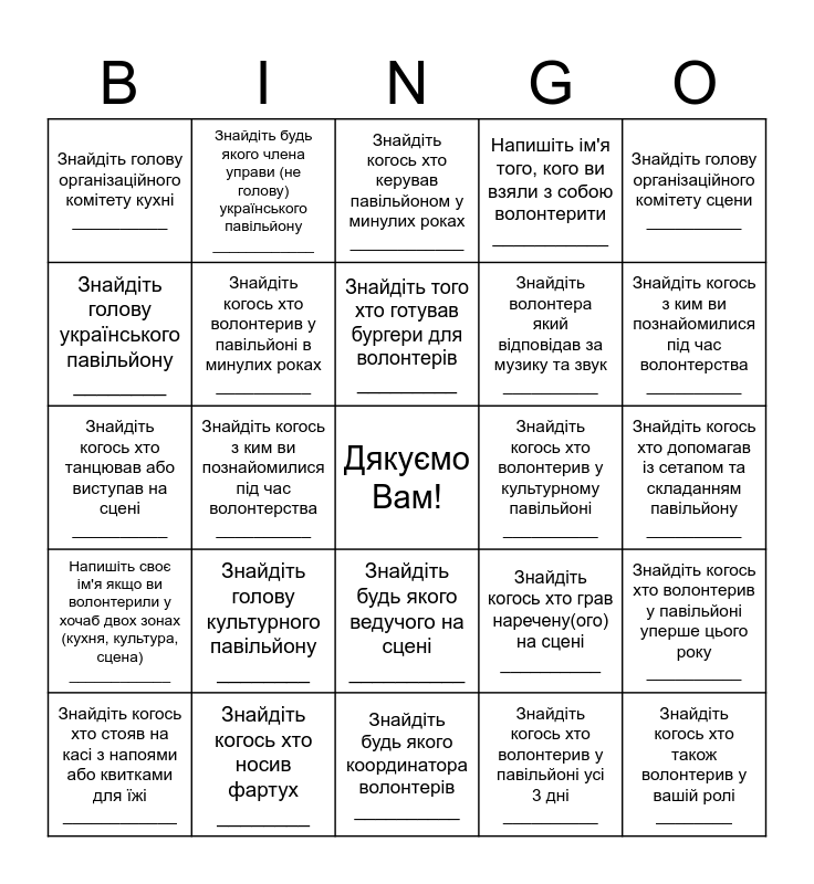 This bingo card has a free space and 24 words: Знайдіть голову культурного павільйону ________, Знайдіть когось хто носив фартух ________, Знайдіть того хто готував бургери для волонтерів _________, Знайдіть когось хто стояв на касі з напоями або квитками для їжі ____________, Знайдіть голову організаційного комітету сцени __________, Знайдіть голову організаційного комітету кухні __________, Знайдіть голову українського павільйону ________, Знайдіть будь якого члена управи (не голову) українського павільйону ____________, Знайдіть когось хто волонтерив у культурному павільйоні __________, Знайдіть будь якого ведучого на сцені __________, Знайдіть волонтера який відповідав за музику та звук __________, Знайдіть когось хто танцював або виступав на сцені __________, Знайдіть когось хто грав наречену(ого) на сцені __________, Знайдіть когось хто волонтерив у павільйоні уперше цього року __________, Знайдіть когось хто волонтерив у павільйоні в минулих роках __________, Знайдіть когось хто волонтерив у павільйоні усі 3 дні __________, Знайдіть когось хто допомагав із сетапом та складанням павільйону __________, Знайдіть когось хто керував павільйоном у минулих роках ____________, Знайдіть когось з ким ви познайомилися під час волонтерства __________, Знайдіть когось з ким ви познайомилися під час волонтерства __________, Знайдіть когось хто також волонтерив у вашій ролі ________, Напишіть своє ім'я якщо ви волонтерили у хочаб двох зонах (кухня, культура, сцена) ____________, Напишіть ім'я того, кого ви взяли з собою волонтерити ___________ and Знайдіть будь якого координатора волонтерів __________.