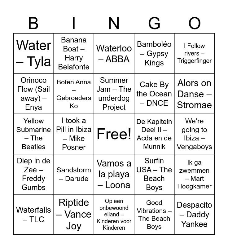 This bingo card has a free space and 27 words: Surfin USA – The Beach Boys, Waterval – K3, Cake By the Ocean – DNCE, Op een onbewoond eiland – Kinderen voor Kinderen, Orinoco Flow (Sail away) – Enya, Waterloo – ABBA, Banana Boat – Harry Belafonte, Diep in de Zee – Freddy Gumbs, De Kapitein Deel II – Acda en de Munnik, Ik ga zwemmen – Mart Hoogkamer, Yellow Submarine – The Beatles, Bamboléo – Gypsy Kings, Waterfalls – TLC, Riptide – Vance Joy, Alors on Danse – Stromae, Moi.. Lolita – Alizée, Boten Anna – Gebroeders Ko, Summer Jam – The underdog Project, Sandstorm – Darude, Water – Tyla, We’re going to Ibiza – Vengaboys, Good Vibrations – The Beach Boys, I took a Pill in Ibiza – Mike Posner, Despacito – Daddy Yankee, Vamos a la playa – Loona, I Follow rivers – Triggerfinger and Pure Shores – All Saints.