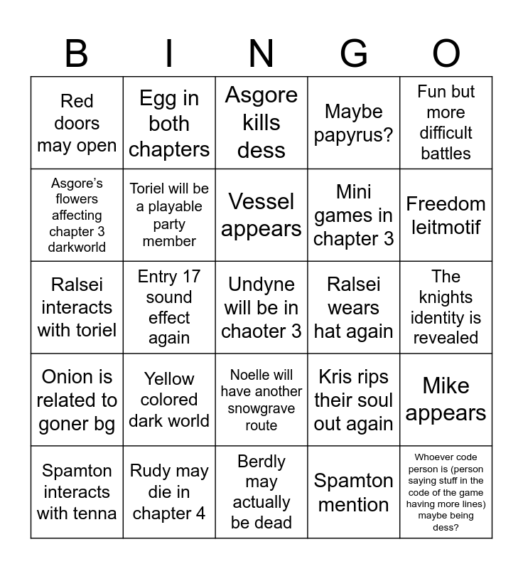 This bingo card has a free space and 24 words: Yellow colored dark world, Rudy may die in chapter 4, Vessel appears, Spamton interacts with tenna, Fun but more difficult battles, Red doors may open, Asgore’s flowers affecting chapter 3 darkworld, Egg in both chapters, Ralsei wears hat again, Noelle will have another snowgrave route, Mini games in chapter 3, Ralsei interacts with toriel, Kris rips their soul out again, Mike appears, Toriel will be a playable party member, Spamton mention, The knights identity is revealed, Asgore kills dess, Freedom leitmotif, Entry 17 sound effect again, Whoever code person is (person saying stuff in the code of the game having more lines) maybe being dess?, Onion is related to goner bg, Maybe papyrus? and Berdly may actually be dead.