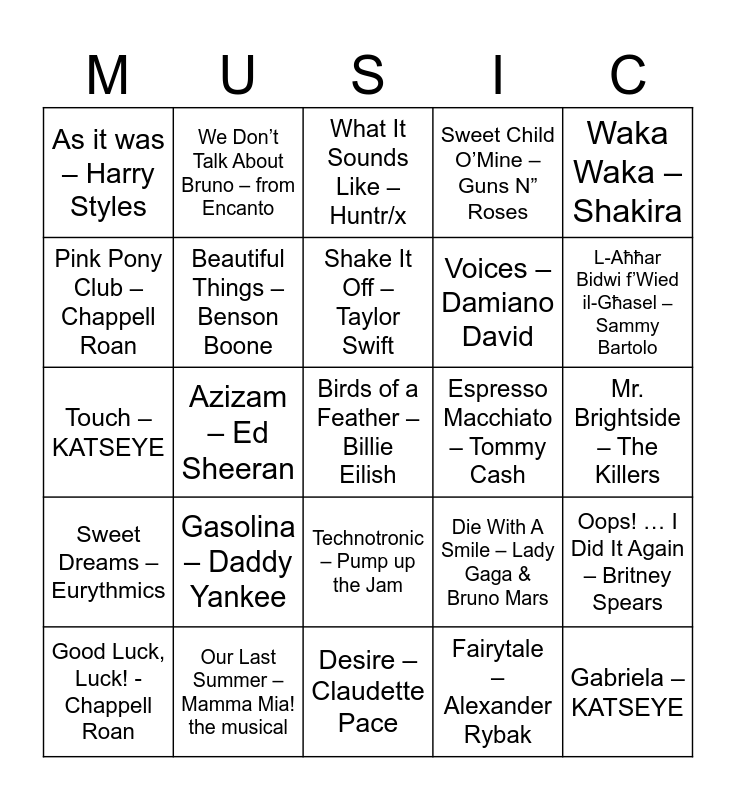 This bingo card has 83 words: Free!, Golden – Huntr/x, What It Sounds Like – Huntr/x, Free – Rumi and Jinu, Soda Pop – Saja Boys, Your Idol – Saja Boys, Macarena – Bayside Boys Remix, Bye Bye Bye - *NSYNC, It’s Gonna Be Me - *NSYNC, I want it that way – Backstreet Boys, APT. – Rose & Bruni Mars, Manchild – Sabrina Carpenter, Beautiful Things – Benson Boone, Espresso Macchiato – Tommy Cash, Sunflower - Post Malone, As it was – Harry Styles, Good Luck, Luck! - Chappell Roan, Pink Pony Club – Chappell Roan, Can’t Stop the Feeling – Justin Timberlake, Just Keep Watching – Tate McRae, Illegal – PinkPantheress, Voices – Damiano David, Birds of a Feather – Billie Eilish, Bad Guy – Billie Eilish, Azizam – Ed Sheeran, Sapphire – Ed Sheeran, Ħafi Paċi Kuluri – The Travellers, Xemx u Xita – The Travellers, Ritmu – AIDAN, Juliette – AIDAN, Gasolina – Daddy Yankee, JUMP – BLACKPINK, Strategy – Twice ft. Megan Thee Stallion, Touch – KATSEYE, Gabriela – KATSEYE, Milkshake – Kelis, Desire – Claudette Pace, Another Summer Night – Fabrizio Faniello, L-Aħħar Bidwi f’Wied il-Għasel – Sammy Bartolo, Sweet Dreams – Eurythmics, Bella Ciao – Manu Pilas, Dynamite – BTS, Butter – BTS, Zombie Nation – Kernkraft 400, Danza Kuduro – Lucenzo ft. Don Omar, Running Up That Hill – Kate Bush, We Don’t Talk About Bruno – from Encanto, The Family Madrigal – from Encanto, Hot Wings – Rio, Abracadabra – Lady Gaga, Die With A Smile – Lady Gaga & Bruno Mars, Sweet Child O’Mine – Guns N” Roses, Mr. Brightside – The Killers, Sk8er Boi – Avril Lavigne, Honey, Honey – Mamma Mia! the musical, Mamma Mia! – Mamma Mia! the musical, Money, Money, Money – Mamma Mia! the musical, Dancing Queen – Mamma Mia! the musical, Our Last Summer – Mamma Mia! the musical, Gimme! Gimme! Gimme! – Mamma Mia! the musical, Cha Cha Slide – DJ Casper, Anxiety – Doechii, Somebody That I Used to Know – Gotye ft. Kimbra, Waka Waka – Shakira, … Baby One More Time – Britney Spears, Oops! … I Did It Again – Britney Spears, Toxic – Britney Spears, Roar – Katy Perry, Hot N’ Cold – Katy Perry, Firework – Katy Perry, How Far I’ll Go – Moana, Nobody Like U – 4*Town, U Know What’s Up – 4*Town, Technotronic – Pump up the Jam, Fairytale – Alexander Rybak, Sweet Caroline – Neil Diamond, Xemx – The Tramps, Shake It Off – Taylor Swift, Anti-Hero – Taylor Swift, Give Me Everything – Pitbull ft. Ne-Yo, Afrojack, Nayer, Rain Over Me – Pitbull ft. Marc Anthony, Hotel Room Service – Pitbull and Fireball – Pitbull.