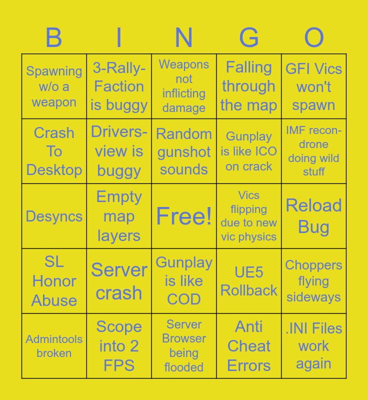 This bingo card has a free space and 24 words: Server crash, Scope into 2 FPS, Random gunshot sounds, Admintools broken, GFI Vics won't spawn, Spawning w/o a weapon, Crash To Desktop, 3-Rally-Faction is buggy, Vics flipping due to new vic physics, Gunplay is like COD, Gunplay is like ICO on crack, Desyncs, UE5 Rollback, Choppers flying sideways, Drivers-view is buggy, Anti Cheat Errors, Reload Bug, Weapons not inflicting damage, IMF recon-drone doing wild stuff, Empty map layers, .INI Files work again, SL Honor Abuse, Falling through the map and Server Browser being flooded.