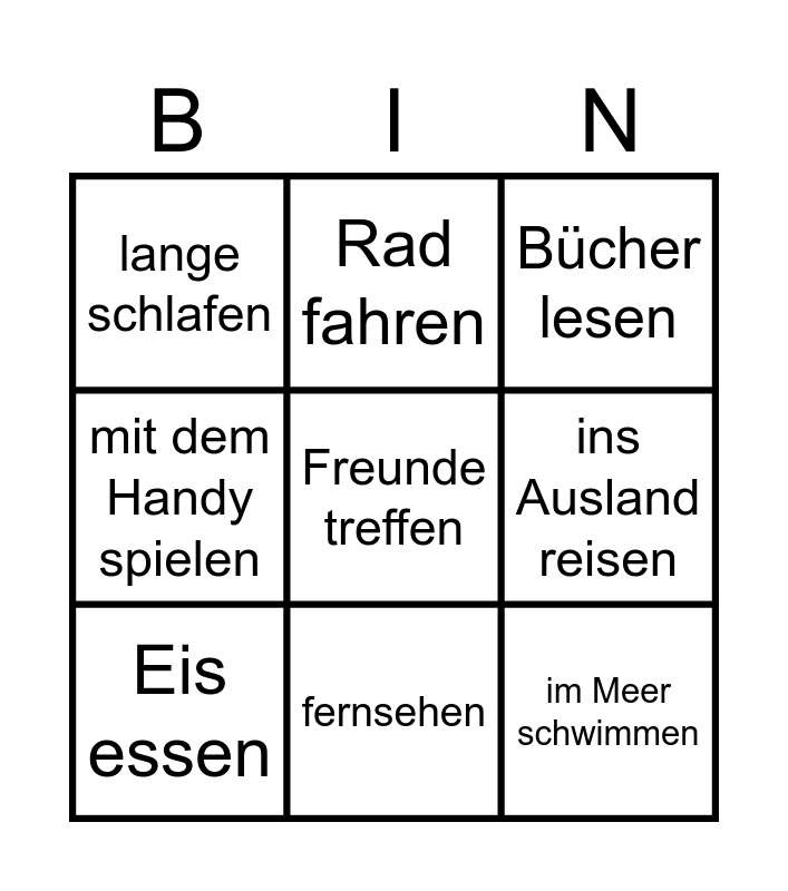 This bingo card has 9 words: Eis essen, Bücher lesen, Rad fahren, mit dem Handy spielen, lange schlafen, ins Ausland reisen, Freunde treffen, im Meer schwimmen and fernsehen.
