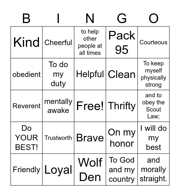 This bingo card has a free space and 24 words: Trustworth, Loyal, Helpful, Friendly, Courteous, Kind, obedient, Cheerful, Thrifty, Brave, Clean, Reverent, On my honor, I will do my best, To do my duty, To God and my country, and to obey the Scout Law;, to help other people at all times, To keep myself physically strong, mentally awake, and morally straight., Do YOUR BEST!, Pack 95 and Wolf Den.