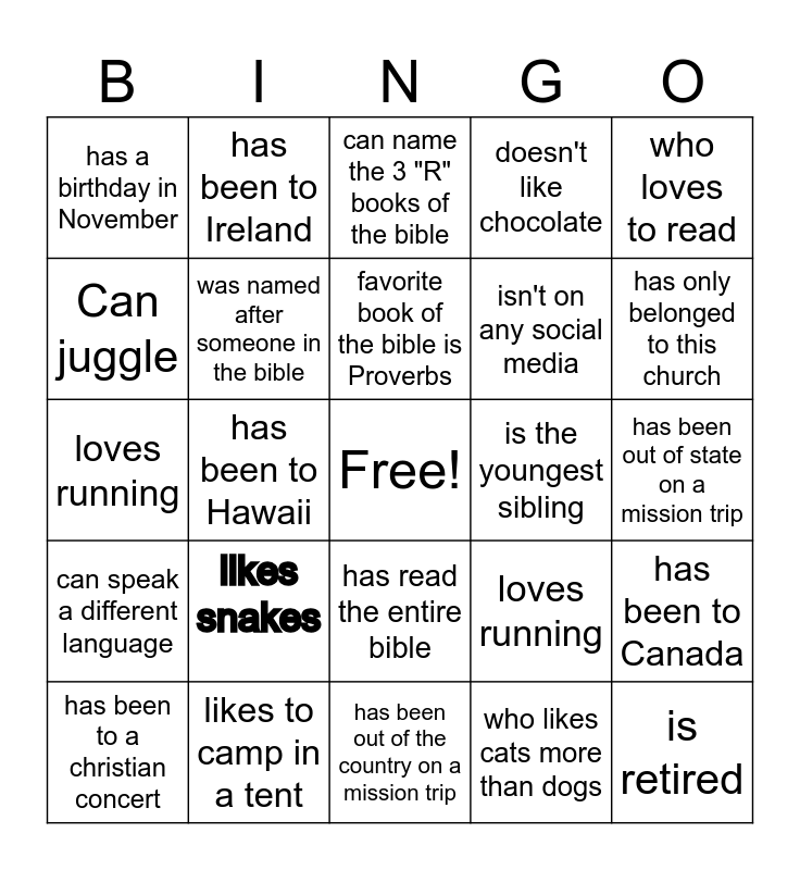 This bingo card has a free space and 24 words: likes snakes, likes to camp in a tent, favorite book of the bible is Proverbs, has been to a christian concert, who loves to read, has a birthday in November, Can juggle, has been to Ireland, is the youngest sibling, has read the entire bible, isn't on any social media, loves running, loves running, has been to Canada, was named after someone in the bible, who likes cats more than dogs, has been out of state on a mission trip, can name the 3 "R" books of the bible, has only belonged to this church, has been to Hawaii, is retired, can speak a different language, doesn't like chocolate and has been out of the country on a mission trip.