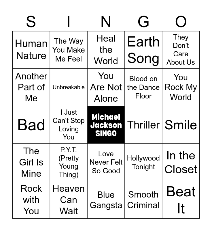 This bingo card has a free space and 44 words: Billie Jean, Beat It, Wanna Be Startin' Somethin', Rock with You, Chicago, Smooth Criminal, Heal the World, Black or White, They Don't Care About Us, Heaven Can Wait, Earth Song, Thriller, Love Never Felt So Good, P.Y.T. (Pretty Young Thing), Remember the Time, Blue Gangsta, Break of Dawn, Bad, Don't Stop 'Til You Get Enough, You Rock My World, The Way You Make Me Feel, 2 Bad, Jam, Human Nature, Scream, Smile, Leave Me Alone, Off the Wall, Hollywood Tonight, The Girl Is Mine, Man in the Mirror, In the Closet, Dirty Diana, She's Out of My Life, I Just Can't Stop Loving You, Dangerous, Workin' Day and Night, Don’t Matter To Me, You Are Not Alone, Another Part of Me, Blood on the Dance Floor, This Place Hotel (a.k.a. Heartbreak Hotel), Unbreakable and Can You Feel It.