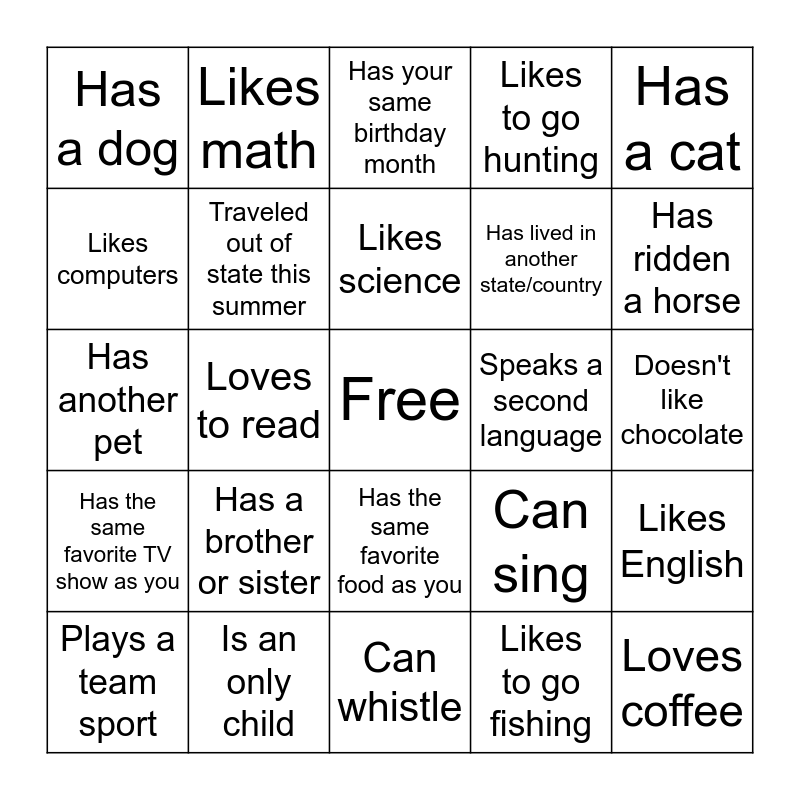This bingo card has a free space and 29 words: Plays a team sport, Plays a musical instrument, Loves to read, Loves video games, Has a dog, Has your same birthday month, Traveled out of state this summer, Has a brother or sister, Speaks a second language, Is an only child, Doesn't like chocolate, Loves coffee, Can whistle, Likes to go fishing, Has ridden a horse, Has been to another country, Has the same favorite food as you, Has the same favorite TV show as you, Has a cat, Has another pet, Can sing, Can draw, Has lived in another state/country, Likes computers, Likes to go hunting, Likes math, Likes English, Likes science and Likes the same subject as you.