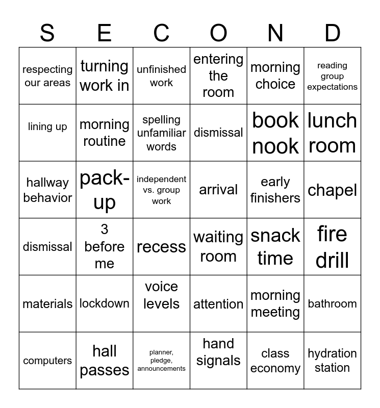 This bingo card has 36 words: attention, voice levels, hand signals, lining up, dismissal, arrival, morning routine, planner, pledge, announcements, morning choice, morning meeting, lunch room, entering the room, bathroom, pack-up, dismissal, respecting our areas, materials, early finishers, hallway behavior, unfinished work, independent vs. group work, 3 before me, waiting room, recess, snack time, turning work in, book nook, hall passes, spelling unfamiliar words, reading group expectations, hydration station, computers, fire drill, chapel, lockdown and class economy.