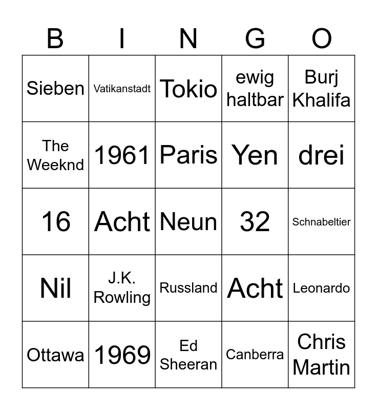 This bingo card has a free space and 24 words: J.K. Rowling, 1969, Paris, Ottawa, Burj Khalifa, Sieben, The Weeknd, Vatikanstadt, 32, Russland, Yen, 16, Acht, Leonardo, 1961, Canberra, Schnabeltier, Tokio, drei, Acht, Chris Martin, Nil, ewig haltbar and Ed Sheeran.