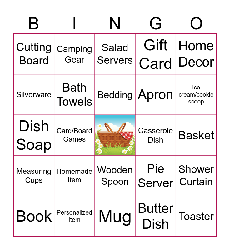 This bingo card has a free space and 24 words: Homemade Item, Personalized Item, Bedding, Book, Home Decor, Cutting Board, Silverware, Camping Gear, Casserole Dish, Wooden Spoon, Apron, Dish Soap, Pie Server, Shower Curtain, Bath Towels, Butter Dish, Basket, Salad Servers, Ice cream/cookie scoop, Card/Board Games, Toaster, Measuring Cups, Gift Card and Mug.