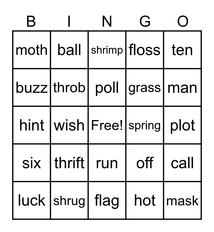 This bingo card has a free space and 29 words: luck, neck, wish, with, moth, shrimp, throb, thrift, spring, shrug, plot, mask, flag, hot, man, lost, run, six, ten, hint, off, still, grass, buzz, floss, ball, call, poll and full.