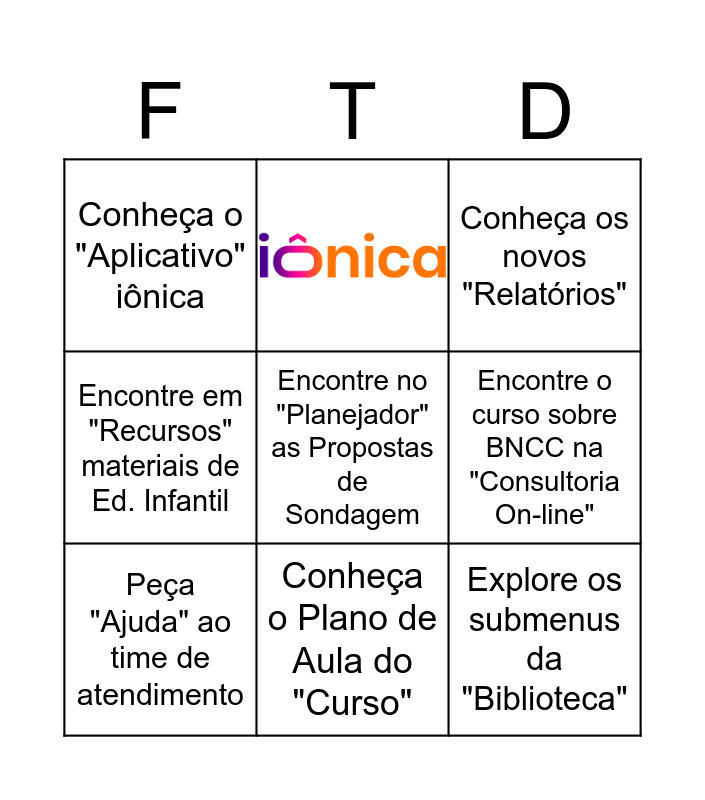 This bingo card has 1 images and 10 words: Explore os submenus da "Biblioteca", Conheça o Plano de Aula do "Curso", Encontre no "Planejador" as Propostas de Sondagem, Peça "Ajuda" ao time de atendimento, Conheça os novos "Relatórios", Encontre o curso sobre BNCC na "Consultoria On-line", "Favorite" um livro, Encontre em "Recursos" materiais de Ed. Infantil, Conheça o "Aplicativo" iônica and Acesse o "Guia para Inclusão".