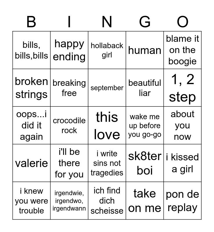 This bingo card has a free space and 50 words: maria maria, pon de replay, everytime we touch, ich find dich scheisse, i'll be there for you, my life would suck without you, happy ending, since u been gone, broken strings, torn, breaking free, human, i kissed a girl, sk8ter boi, you got me, flowers, september, wake me up before you go-go, i want you back, blame it on the boogie, crocodile rock, take on me, bills, bills,bills, beautiful liar, don't cha, love don't cost a thing, 1, 2 step, promiscous, hollaback girl, i write sins not tragedies, teenagers, mr. brightside, american idiot, misery buisness, irgendwie, irgendwo, irgendwann, tage wie diese, geile zeit, männer, schwarz zu blau, about you now, save your tears, one dance, suga suga, samba si, arbeit no, i knew you were trouble, oops...i did it again, belive, dancing queen, valerie and just dance.