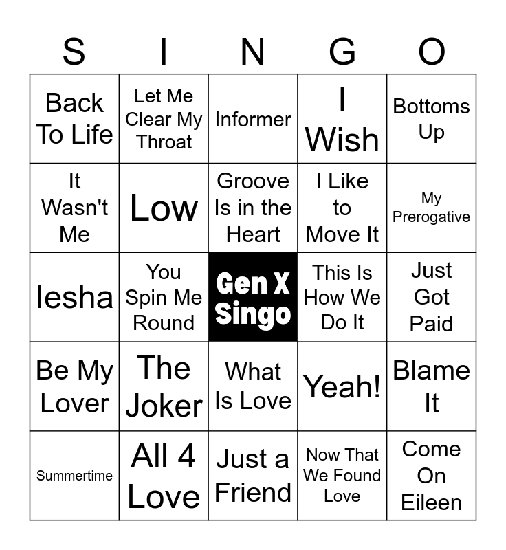 This bingo card has a free space and 50 words: Dancing Queen, Come On Eileen, Don't You Want Me, Just a Friend, The Joker, All Summer Long, Let Me Clear My Throat, Ice Ice Baby, It Wasn't Me, Here Comes the Hotstepper, Low, I Wish, Blame It, Yeah!, Party Rock Anthem, Bartender, Groove Is in the Heart, This Is How We Do It, Boombastic, Bottoms Up, You Spin Me Round, Now That We Found Love, Back To Life, I Like to Move It, Girl You Know It's True, Return of the Mack, My Prerogative, Everybody Everybody, Informer, What Is Love, Right Round, Jessie's Girl, Poison, It Takes Two, All 4 Love, Candy Rain, Right Here, Tennessee, Freak Like Me, Just Got Paid, Remember the Time, If I Had No Loot, Here We Go Again!, Human Nature, Summertime, Iesha, Playground, Tonight Is The Night, Be My Lover and Waterfalls.