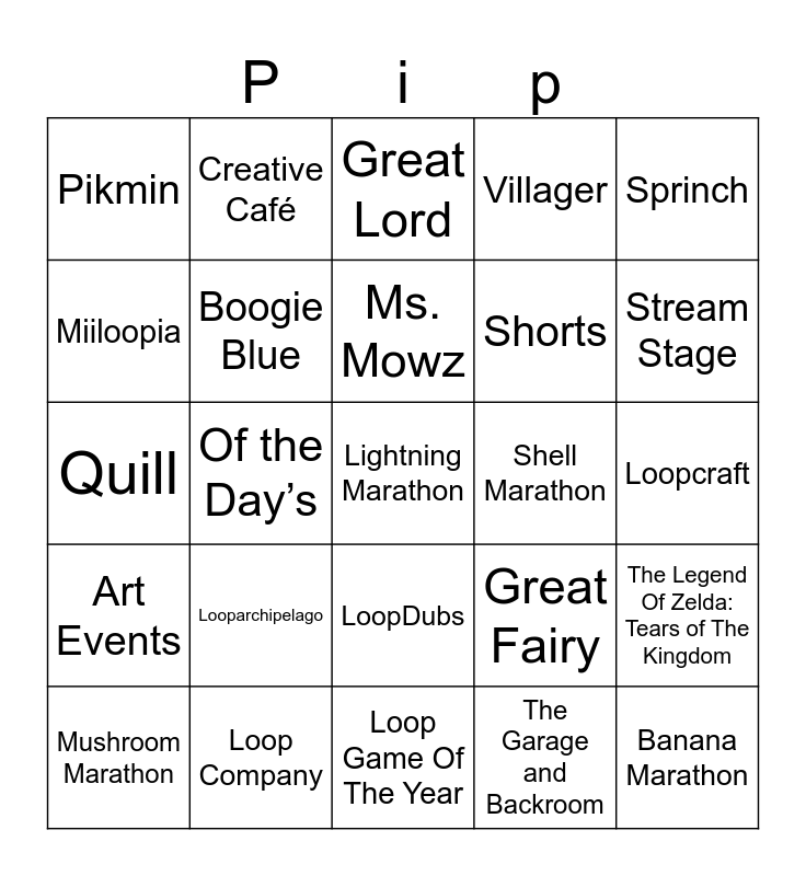 This bingo card has 78 words: Nintendo Loop, Guardians, Great Lord, High Lord, Lord, Nitro Boo-Ster, Spirit, Boo, Gym Leader, Subrosian, Star Warrior, Inkling, Villager, Pikmin, Hall Of Frame, Miiloopia, NL Error DataBase, Looparchipelago, Objections, Loopcraft, Booyah, Sprinch, Quill, Ms. Mowz, Boogie Blue, Pink Huu, Boogie Huu, Official Events, 24/7 Stream, GBA Update, Stream Stage, Loop Hunger Games, Loop Game Of The Year, Banana Marathon, Mushroom Marathon, Shell Marathon, Flower Marathon, Leaf Marathon, Star Marathon, Lightning Marathon, Special Marathon, Personal Event, Notes, August 29th 2020, Requests, Creative Café, Backlog Binge, Loopdachi, Kirby and the Forgotten Land, Metroid Dread, The Legend Of Zelda: Tears of The Kingdom, Of the Day’s, Great Fairy, Mario Kart Weekly Hangout, Loop Town, Fan Art Gallery, Moments, Easter Egg/Snowflake Competition, VGT Club, LoopDubs, Shorts, Birthday Spotlight, Role Corner, Server Partners, Note Shop, Discord, Mario & Luigi: Brothership, Lucky Lord, Art Events, Loop Company, Final Fantasy Raids, Splatoon Events, Jackbox Parties, Shiny Hunts, The Garage and Backroom, Lord & Fairy Beats, Pokedex Trivia and Nia & Dromarch.