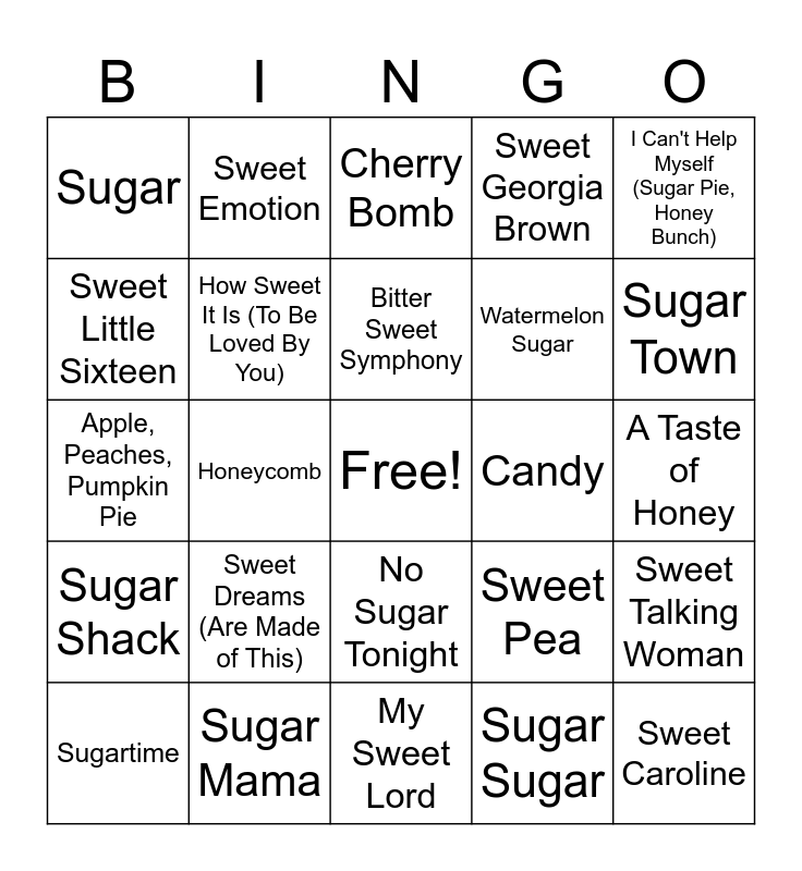 This bingo card has a free space and 49 words: Sweet Child O' Mine, Sweet Caroline, Sweet Home Alabama, My Sweet Lord, Sweet Dreams (Are Made of This), Sweet City Woman, Sweet Emotion, Sweet Inspiration, Sweet Little Sixteen, Sweet Surrender, How Sweet It Is (To Be Loved By You), Sweet Georgia Brown, Sweet Talking Woman, Sweet Pea, Sweet Soul Music, Sweet Love, Bitter Sweet Symphony, Candy, I Want Candy, I Can't Help Myself (Sugar Pie, Honey Bunch), Honeycomb, Sugar Sugar, Sugar, Watermelon Sugar, Pour Some Sugar On Me, Sugar Town, Sugartime, Lollipop, No Sugar Tonight, Sugar Shack, Candy Man, Tupelo Honey, The Sweetest Taboo, A Spoonful of Sugar, Sugar Mama, Honey Honey, Honey Bee, Honey Don't, A Taste of Honey, If You Got the Money Honey, I Got the Time, Wild Mountain Honey, Honey Hush, Candy Girl, Tutti Frutti, Apple, Peaches, Pumpkin Pie, Cherry Bomb, A Marshmallow World, Milkshake and Cake By the Ocean.