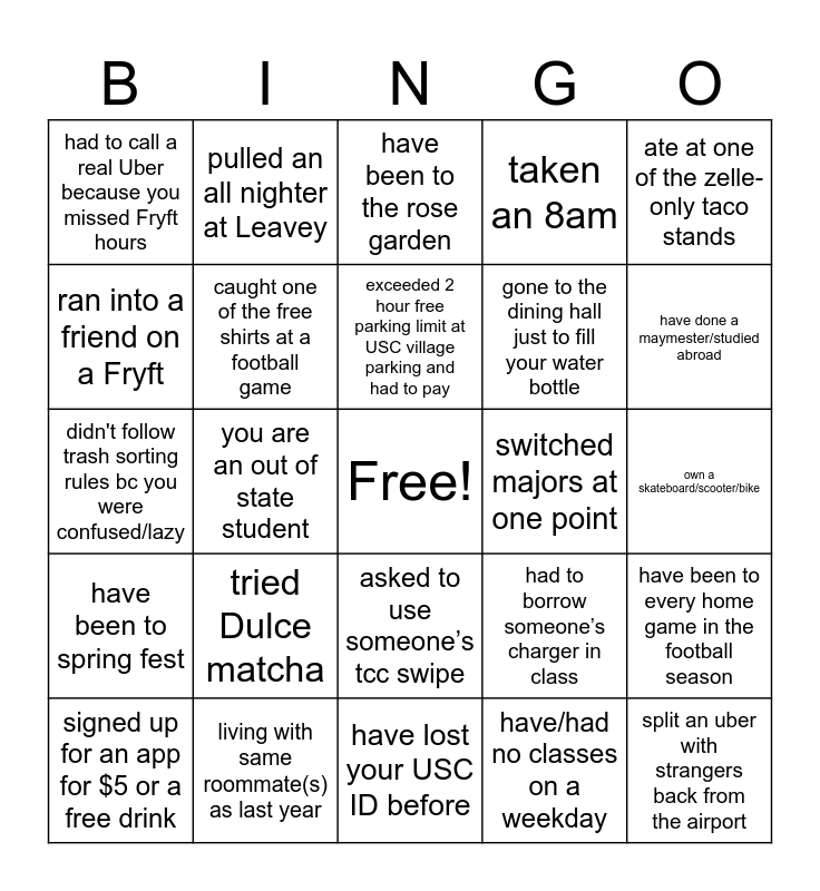 This bingo card has a free space and 25 words: tried Dulce matcha, have lost your USC ID before, exceeded 2 hour free parking limit at USC village parking and had to pay, signed up for an app for $5 or a free drink, ate at one of the zelle-only taco stands, had to call a real Uber because you missed Fryft hours, ran into a friend on a Fryft, pulled an all nighter at Leavey, switched majors at one point, asked to use someone’s tcc swipe, gone to the dining hall just to fill your water bottle, didn't follow trash sorting rules bc you were confused/lazy, had to borrow someone’s charger in class, have been to every home game in the football season, caught one of the free shirts at a football game, not your first time living in cale&irani, own a skateboard/scooter/bike, have been to the rose garden, have done a maymester/studied abroad, you are an out of state student, split an uber with strangers back from the airport, living with same roommate(s) as last year, have been to spring fest, taken an 8am and have/had no classes on a weekday.