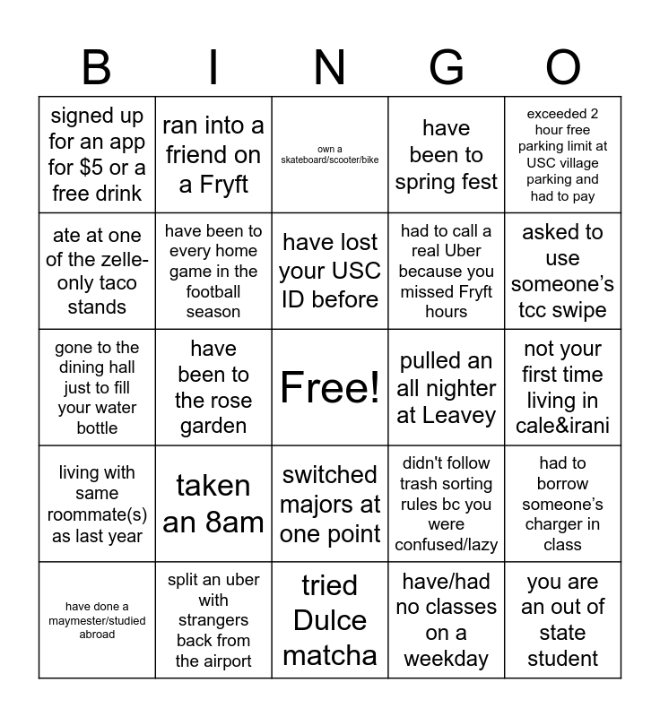 This bingo card has a free space and 25 words: taken an 8am, tried Dulce matcha, have lost your USC ID before, have done a maymester/studied abroad, exceeded 2 hour free parking limit at USC village parking and had to pay, signed up for an app for $5 or a free drink, ate at one of the zelle-only taco stands, ran into a friend on a Fryft, pulled an all nighter at Leavey, switched majors at one point, had to call a real Uber because you missed Fryft hours, gone to the dining hall just to fill your water bottle, didn't follow trash sorting rules bc you were confused/lazy, had to borrow someone’s charger in class, have been to every home game in the football season, caught one of the free shirts at a football game, not your first time living in cale&irani, own a skateboard/scooter/bike, asked to use someone’s tcc swipe, have been to the rose garden, you are an out of state student, split an uber with strangers back from the airport, living with same roommate(s) as last year, have been to spring fest and have/had no classes on a weekday.
