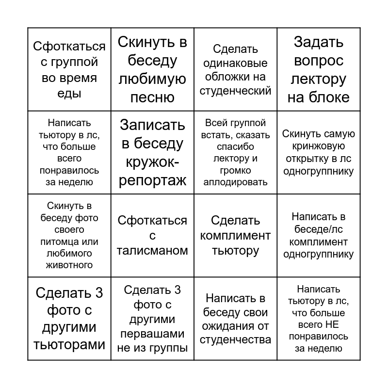 This bingo card has 16 words: Сделать 3 фото с другими первашами не из группы, Написать в беседе/лс комплимент одногруппнику, Сделать одинаковые обложки на студенческий, Сфоткаться с группой во время еды, Скинуть в беседу фото своего питомца или любимого животного, Скинуть в беседу любимую песню, Сделать комплимент тьютору, Написать в беседу свои ожидания от студенчества, Написать тьютору в лс, что больше всего понравилось за неделю, Записать в беседу кружок-репортаж, Сделать 3 фото с другими тьюторами, Задать вопрос лектору на блоке, Сфоткаться с талисманом, Скинуть самую кринжовую открытку в лс одногруппнику, Всей группой встать, сказать спасибо лектору и громко аплодировать and Написать тьютору в лс, что больше всего НЕ понравилось за неделю.