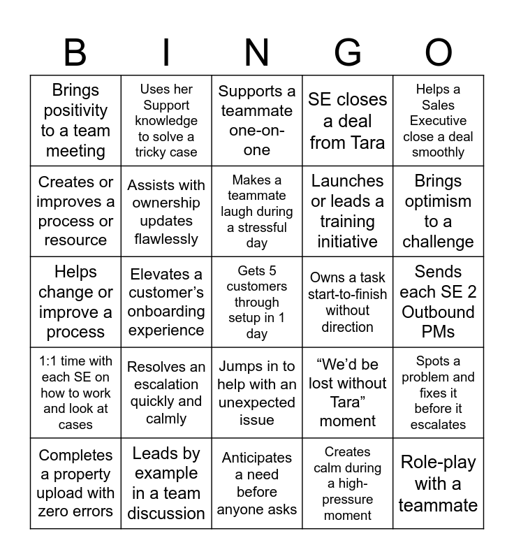 This bingo card has 25 words: Resolves an escalation quickly and calmly, Anticipates a need before anyone asks, Makes a teammate laugh during a stressful day, Completes a property upload with zero errors, Helps a Sales Executive close a deal smoothly, Brings positivity to a team meeting, Creates or improves a process or resource, Uses her Support knowledge to solve a tricky case, Owns a task start-to-finish without direction, Jumps in to help with an unexpected issue, Launches or leads a training initiative, Helps change or improve a process, “We’d be lost without Tara” moment, Spots a problem and fixes it before it escalates, Assists with ownership updates flawlessly, Role-play with a teammate, Sends each SE 2 Outbound PMs, Supports a teammate one-on-one, Brings optimism to a challenge, Elevates a customer’s onboarding experience, Gets 5 customers through setup in 1 day, Leads by example in a team discussion, 1:1 time with each SE on how to work and look at cases, SE closes a deal from Tara and Creates calm during a high-pressure moment.