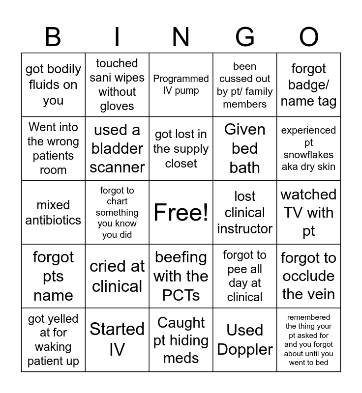 This bingo card has a free space and 24 words: cried at clinical, Started IV, got lost in the supply closet, got yelled at for waking patient up, forgot badge/ name tag, got bodily fluids on you, Went into the wrong patients room, touched sani wipes without gloves, lost clinical instructor, beefing with the PCTs, Given bed bath, mixed antibiotics, forgot to pee all day at clinical, forgot to occlude the vein, used a bladder scanner, Used Doppler, watched TV with pt, Programmed IV pump, experienced pt snowflakes aka dry skin, forgot to chart something you know you did, remembered the thing your pt asked for and you forgot about until you went to bed, forgot pts name, been cussed out by pt/ family members and Caught pt hiding meds.