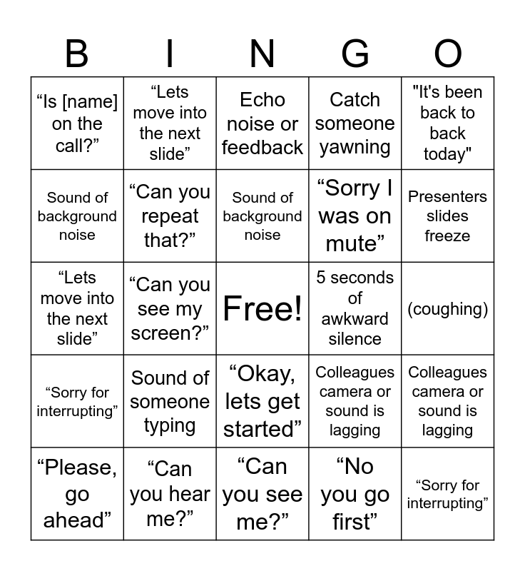 ⚠ This card has duplicate items: Child or animal noise (2), Presenters slides freeze (2), Multiple people speak at once (2), “No you go first” (2), (coughing) (2), Someone on call stands up/ walks away from camera (2), “Lets move into the next slide” (2), “Can you repeat that?” (2), “Sorry I was on mute” (2), Sound of someone typing (2), Sound of background noise (2), “Can you see my screen?” (2), Colleagues camera or sound is lagging (2), “Sorry for interrupting” (2), “…technical difficulties” (2), “Okay, lets get started” (2), Echo noise or feedback (2), 5 seconds of awkward silence (2), “Please, go ahead” (2), “Can you hear me?” (2), “Can you see me?” (2), Catch someone yawning (2)