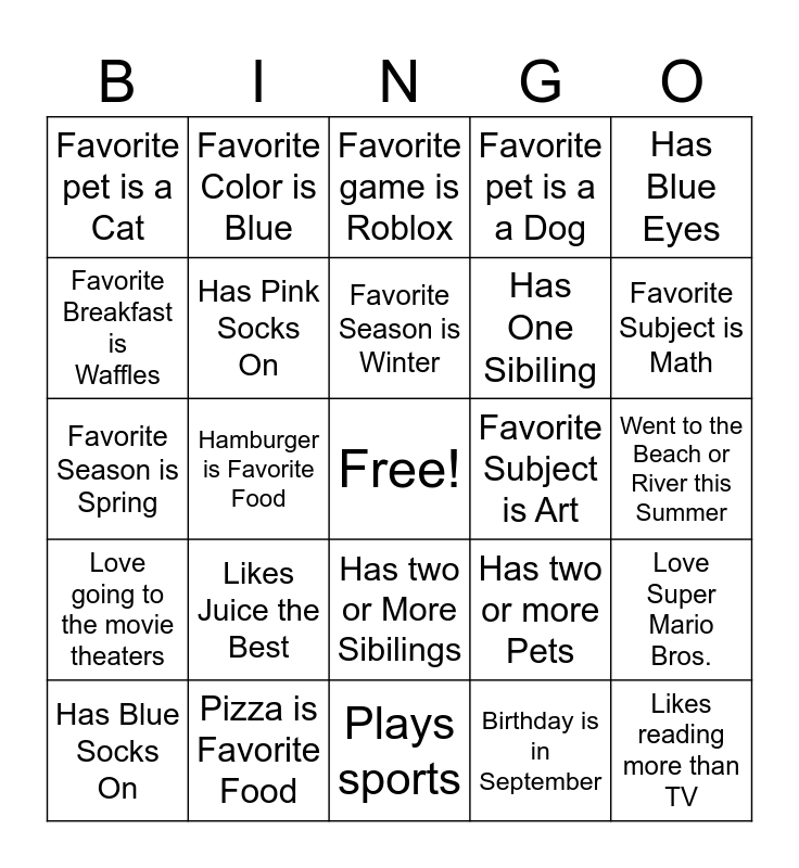 This bingo card has a free space and 24 words: Likes Juice the Best, Pizza is Favorite Food, Favorite Season is Winter, Has Blue Socks On, Has Blue Eyes, Favorite pet is a Cat, Favorite Breakfast is Waffles, Favorite Color is Blue, Favorite Subject is Art, Has two or More Sibilings, Has One Sibiling, Favorite Season is Spring, Has two or more Pets, Love Super Mario Bros., Has Pink Socks On, Birthday is in September, Went to the Beach or River this Summer, Favorite game is Roblox, Favorite Subject is Math, Hamburger is Favorite Food, Likes reading more than TV, Love going to the movie theaters, Favorite pet is a a Dog and Plays sports.