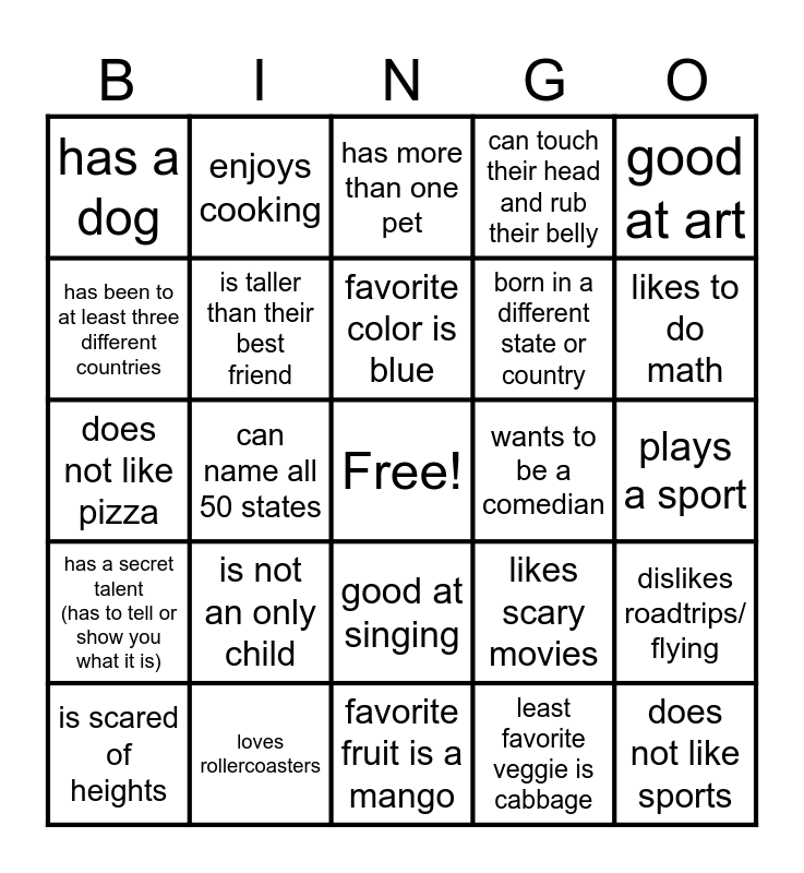 This bingo card has a free space and 29 words: is scared of heights, watches anime, can name all 50 states, plays roblox, has a dog, has more than one pet, is taller than their best friend, is not an only child, wants to be a comedian, loves rollercoasters, plays a sport, does not like sports, favorite fruit is a mango, least favorite veggie is cabbage, likes to do math, likes to read, good at singing, has a secret talent (has to tell or show you what it is), good at art, does not like pizza, likes scary movies, knows the macarena, born in a different state or country, has been to at least three different countries, can touch their head and rub their belly, enjoys cooking, dislikes roadtrips/ flying, favorite color is blue and is born in month that ends with -ber.