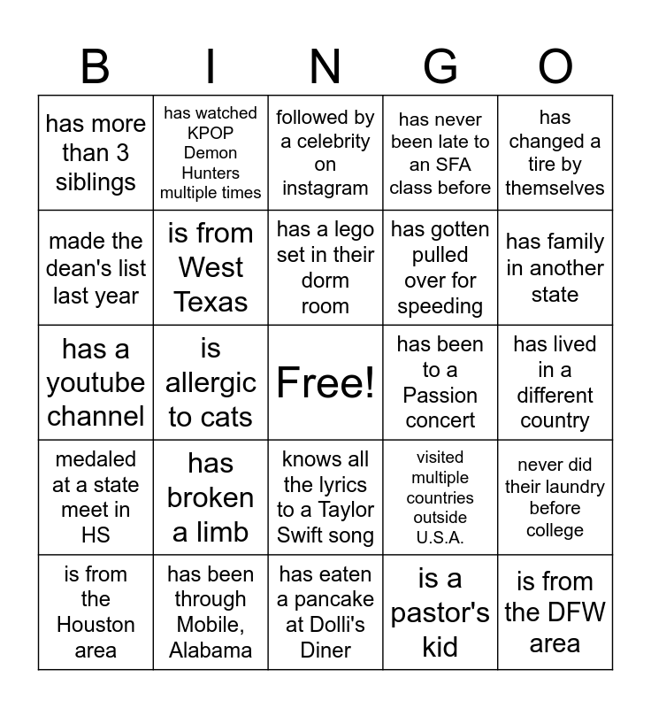 This bingo card has a free space and 24 words: has broken a limb, has been through Mobile, Alabama, has a lego set in their dorm room, is from the Houston area, has changed a tire by themselves, has more than 3 siblings, made the dean's list last year, has watched KPOP Demon Hunters multiple times, has been to a Passion concert, knows all the lyrics to a Taylor Swift song, has gotten pulled over for speeding, has a youtube channel, visited multiple countries outside U.S.A., never did their laundry before college, is from West Texas, is a pastor's kid, has lived in a different country, followed by a celebrity on instagram, has family in another state, is allergic to cats, is from the DFW area, medaled at a state meet in HS, has never been late to an SFA class before and has eaten a pancake at Dolli's Diner.