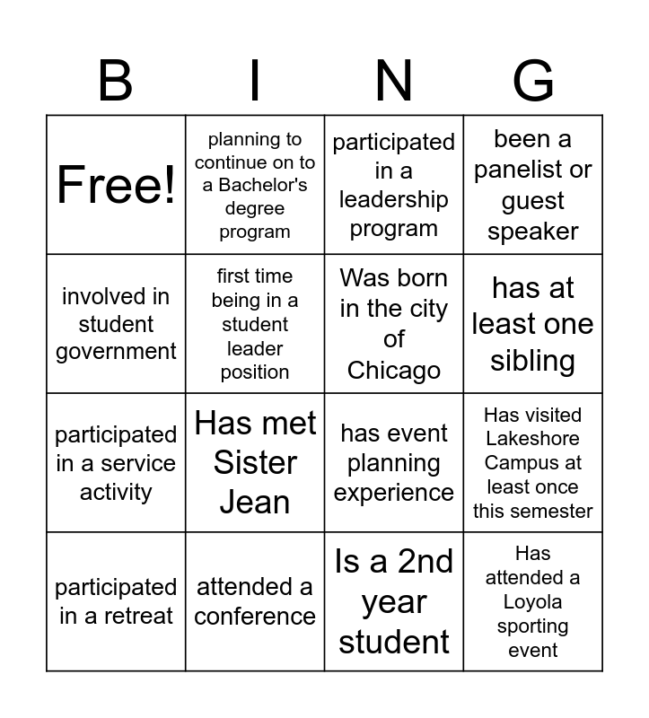 This bingo card has 16 words: participated in a retreat, attended a conference, participated in a leadership program, been a panelist or guest speaker, involved in student government, planning to continue on to a Bachelor's degree program, has event planning experience, Has visited Lakeshore Campus at least once this semester, Free!, first time being in a student leader position, Is a 2nd year student, has at least one sibling, participated in a service activity, Has met Sister Jean, Was born in the city of Chicago and Has attended a Loyola sporting event.