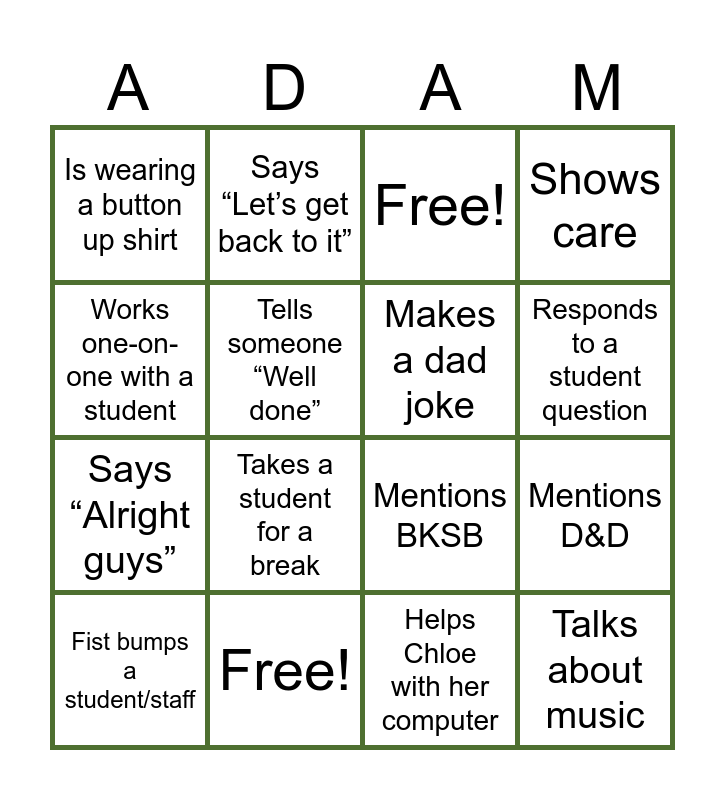 This bingo card has 16 words: Free!, Mentions D&D, Free!, Is wearing a button up shirt, Says “Alright guys”, Says “Let’s get back to it”, Mentions BKSB, Helps Chloe with her computer, Works one-on-one with a student, Tells someone “Well done”, Fist bumps a student/staff, Shows care, Takes a student for a break, Responds to a student question, Makes a dad joke and Talks about music.