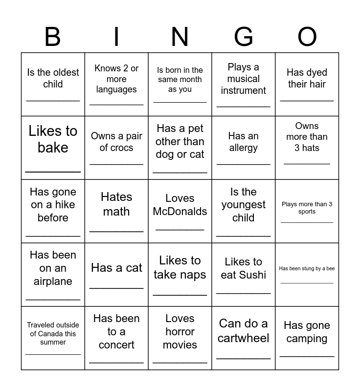 This bingo card has 28 words: Has been stung by a bee ___________________, Has broken a bone _________, Has an allergy __________, Can do a cartwheel ________, Likes to bake _______, Is born in the same month as you ____________, Knows 2 or more languages ___________, Has been on an airplane _________, Is the youngest child _________, Traveled outside of Canada this summer ______________, Has gone on a hike before _________, Plays a musical instrument __________, Has been to a concert _________, Loves horror movies _________, Owns more than 3 hats _________, Has been to Grouse Mountain _________, Has a cat ________, Owns a pair of crocs __________, Has a pet other than dog or cat _________, Likes to take naps ________, Is the oldest child __________, Has gone camping _________, Loves McDonalds ________, Hates math ________, Plays more than 3 sports _______________, Likes to eat Sushi _________, Has dyed their hair __________ and Has been on a rollercoaster ___________.