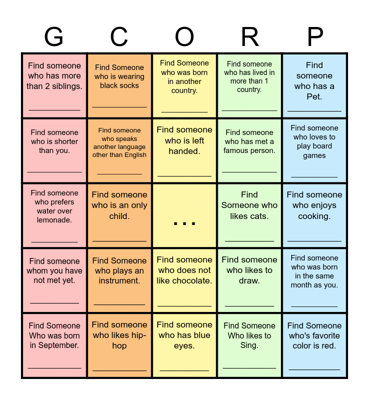 This bingo card has a free space and 24 words: Find Someone Who was born in September. ____________, Find Someone who plays an instrument. ___________, Find someone who is left handed. ___________, Find Someone Who likes to Sing. ____________, Find someone who has a Pet. ___________, Find someone who has more than 2 siblings. ___________, Find Someone who is wearing black socks _____________, Find Someone who was born in another country. ___________, Find Someone who likes cats. __________, Find someone who enjoys cooking. ___________, Find someone who prefers water over lemonade. ___________, Find someone who speaks another language other than English ____________, Find someone who likes to draw. __________, Find someone who was born in the same month as you. ___________, Find someone who is shorter than you. _____________, Find someone who likes hip-hop ___________, Find someone who has blue eyes. __________, Find someone who has lived in more than 1 country. ______________, Find someone who loves to play board games ___________, Find someone whom you have not met yet. ___________, Find someone who is an only child. ___________, Find someone who does not like chocolate. ___________, Find someone who has met a famous person. _____________ and Find Someone who's favorite color is red. ___________.