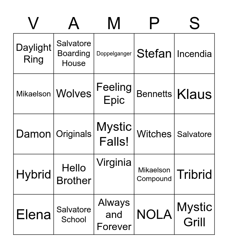 This bingo card has a free space and 24 words: Hello Brother, Salvatore School, Feeling Epic, Elena, Incendia, Daylight Ring, Mikaelson, Salvatore Boarding House, Witches, Virginia, Bennetts, Damon, Mikaelson Compound, Tribrid, Wolves, NOLA, Salvatore, Doppelganger, Klaus, Originals, Mystic Grill, Hybrid, Stefan and Always and Forever.