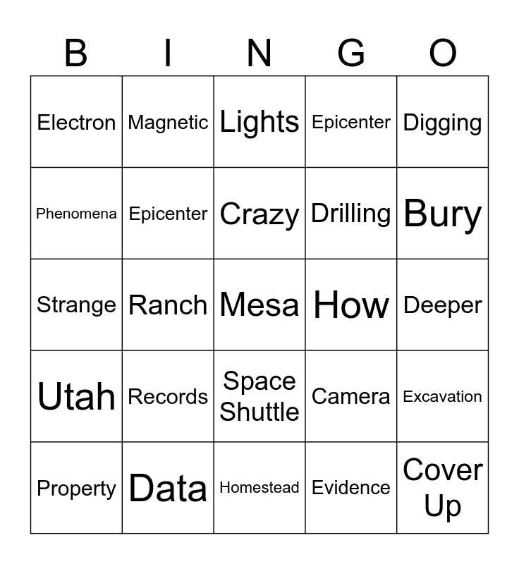 This bingo card has a free space and 64 words: 1964, Spoils, Archaeological, Excavation, Drill Site, Ceramic, Magnetic, Metallic, Crazy, Man made, Space Shuttle, Mystery, Deeper, Digging, Answers, Phenomena, Ranch, Electron, Helping, Drilling, Records, Utah, Epicenter, Strange, Evidence, UAP, Energy, Portals, Anomaly, GHz, Investigation, Massive, Object, Engineered, Bury, Property, Possible, Evidence, Coincidence, Epicenter, Strange, How, Why, NASA, Crash, Cover Up, Data, Borehole, Camera, Site, Triangle, Sandstone, Homestead, Pushing, Copy that/ 10-4, Collected, Lights, What the Heck, Smoke, Bubble, Rocket, Drone, Experiment and Season.