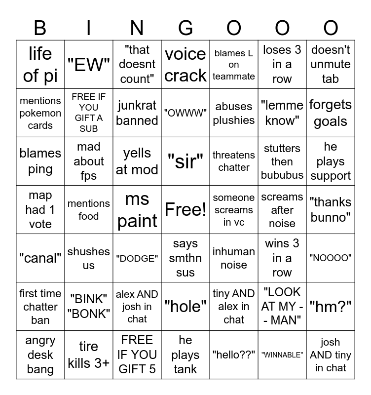 This bingo card has a free space and 51 words: angry desk bang, "lemme know", "-or nah", mentions food, yells at mod, inhuman noise, "EW", "hello??", loses 3 in a row, wins 3 in a row, doesn't unmute tab, voice crack, stutters then bububus, threatens chatter, "hole", "canal", mentions pokemon cards, forgets goals, tire kills 3+, blames L on teammate, abuses plushies, ms paint, life of pi, FREE IF YOU GIFT A SUB, FREE IF YOU GIFT 5, josh AND tiny in chat, junkrat banned, he plays tank, he plays support, "that doesnt count", watch this, shushes us, alex AND josh in chat, tiny AND alex in chat, says smthn sus, map had 1 vote, screams after noise, "NOOOO", first time chatter ban, "BINK" "BONK", blames ping, mad about fps, "LOOK AT MY -- MAN", "WINNABLE", someone screams in vc, "thanks bunno", "OWWW", "DODGE", "hm?", "sir" and audible cup put down.