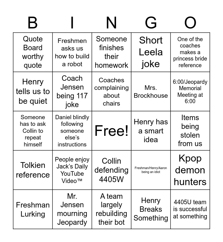 This bingo card has a free space and 26 words: Collin defending 4405W, Henry Breaks Something, Coaches complaining about chairs, Mr. Jensen mourning Jeopardy, One of the coaches makes a princess bride reference, Quote Board worthy quote, Henry tells us to be quiet, Freshmen asks us how to build a robot, Items being stolen from us, Freshman/Henry/Aaron being an idiot, Mrs. Brockhouse, Someone has to ask Collin to repeat himself, Kpop demon hunters, Freshman Lurking, Daniel blindly following someone else’s instructions, Kate misses robotics for soccer, Short Leela joke, Tolkien reference, Someone finishes their homework, 4405U team is successful at something, 6:00/Jeopardy Memorial Meeting at 6:00, A team largely rebuilding their bot, Henry has a smart idea, People enjoy Jack’s Daily YouTube Video™, Coach Jensen being 117 joke and Leela killed Santa joke.