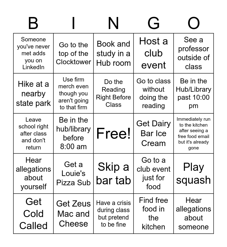 This bingo card has a free space and 24 words: Get a Louie's Pizza Sub, Get Zeus Mac and Cheese, Do the Reading Right Before Class, Get Cold Called, See a professor outside of class, Someone you've never met adds you on LinkedIn, Hike at a nearby state park, Go to the top of the Clocktower, Get Dairy Bar Ice Cream, Skip a bar tab, Go to class without doing the reading, Leave school right after class and don't return, Go to a club event just for food, Play squash, Use firm merch even though you aren't going to that firm, Find free food in the kitchen, Immediately run to the kitchen after seeing a free food email but it's already gone, Book and study in a Hub room, Be in the Hub/Library past 10:00 pm, Be in the hub/library before 8:00 am, Hear allegations about someone, Hear allegations about yourself, Host a club event and Have a crisis during class but pretend to be fine.