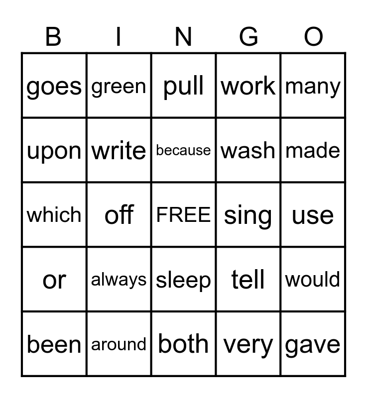 This bingo card has a free space and 24 words: always, around, because, been, many, goes, upon, green, sing, sleep, wash, which, tell, would, write, very, use, pull, made, off, gave, or, work and both.