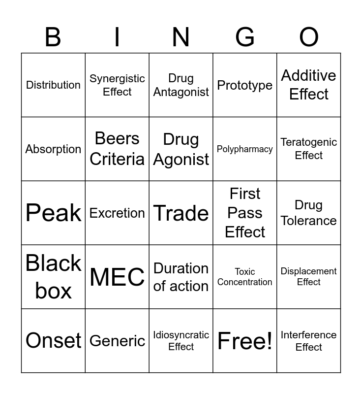 This bingo card has 32 words: Free!, Metabolism, Excretion, Controlled substance, Black box, Beers Criteria, Additive Effect, Displacement Effect, Synergistic Effect, Interference Effect, Drug Agonist, Drug Antagonist, Antidote, Bioavailability, First Pass Effect, Therapeutic Level, Onset, Peak, Duration of action, MEC, Toxic Concentration, Serum Half Life, Drug Tolerance, Generic, Trade, Prototype, Polypharmacy, Absorption, Distribution, Idiosyncratic Effect, Anaphylactic Effect and Teratogenic Effect.