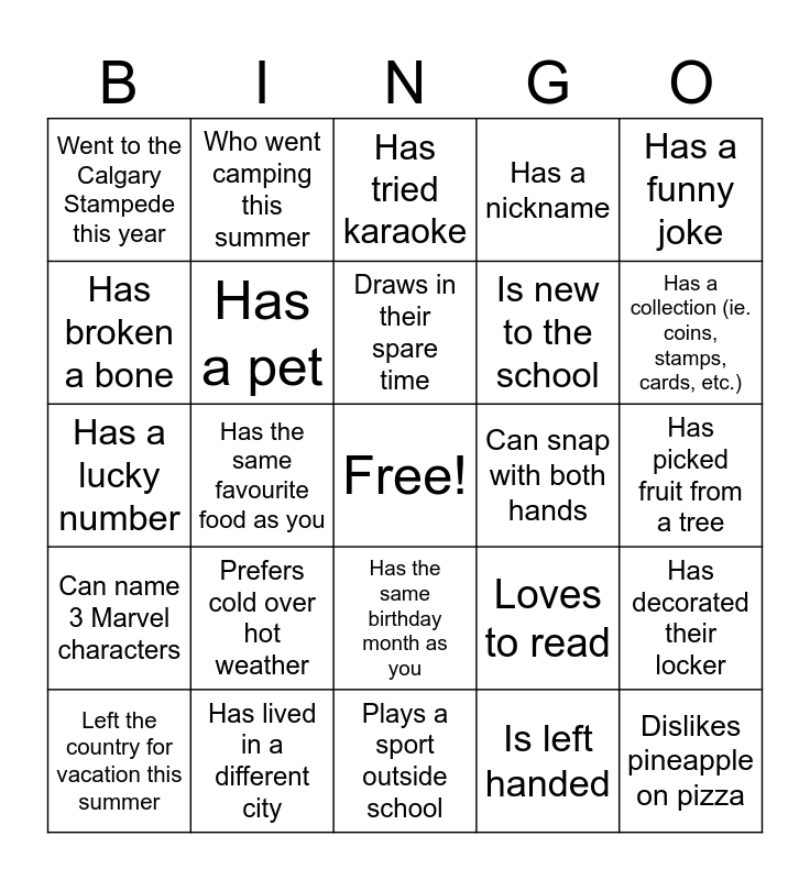 This bingo card has a free space and 29 words: Left the country for vacation this summer, Likes to hike, Has the same favourite food as you, Has a sibling, Went to the Calgary Stampede this year, Has tried karaoke, Has a pet, Prefers cold over hot weather, Can snap with both hands, Has lived in a different city, Has picked fruit from a tree, Dislikes pineapple on pizza, Plays a sport outside school, Is left handed, Has a collection (ie. coins, stamps, cards, etc.), Loves to sing in the car, Has the same birthday month as you, Can name 3 Marvel characters, Has a funny joke, Has a lucky number, Loves to read, Has met a celebrity, Is new to the school, Has broken a bone, Has a nickname, Who went camping this summer, Has decorated their locker, Draws in their spare time and Can name the months backwards.