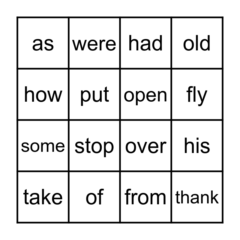This bingo card has 16 words: of, his, had, as, some, were, over, from, how, put, take, old, stop, fly, open and thank.
