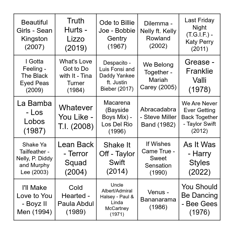 This bingo card has 65 words: Golden - Huntr/x (2025), A Bar Song (Tipsy) - Shaboozey (2024), Rich Men North of Richmond - Oliver Anthony Music (2023), As It Was - Harry Styles (2022), Stay - The Kid Laroi and Justin Bieber (2021), Dynamite - BTS (2020), Truth Hurts - Lizzo (2019), In My Feelings - Drake (2018), Despacito - Luis Fonsi and Daddy Yankee ft. Justin Bieber (2017), Cheerleader - OMI (2015), Shake It Off - Taylor Swift (2014), Blurred Lines - Robin Thicke ft. T.I. and Pharrell (2013), We Are Never Ever Getting Back Together - Taylor Swift (2012), Last Friday Night (T.G.I.F.) - Katy Perry (2011), Love the Way You Lie - Eminem ft. Rihanna (2010), I Gotta Feeling - The Black Eyed Peas (2009), Whatever You Like - T.I. (2008), Beautiful Girls - Sean Kingston (2007), London Bridge - Fergie (2006), We Belong Together - Mariah Carey (2005), Lean Back - Terror Squad (2004), Shake Ya Tailfeather - Nelly, P. Diddy and Murphy Lee (2003), Dilemma - Nelly ft. Kelly Rowland (2002), Fallin' - Alicia Keys (2001), Doesn't Really Matter - Janet (2000), Bailamos - Enrique Iglesias (1999), I Don't Want to Miss a Thing - Aerosmith (1998), Mo Money Mo Problems - The Notorious B.I.G. ft. Puff Daddy and Mase (1997), Macarena (Bayside Boys Mix) - Los Del Rio (1996), You Are Not Alone - Michael Jackson (1995), I'll Make Love to You - Boyz II Men (1994), Can't Help Falling in Love - UB40 (1993), End of the Road - Boyz II Men (1992), (Everything I Do) I Do It for You - Bryan Adams (1991), If Wishes Came True - Sweet Sensation (1990), Cold Hearted - Paula Abdul (1989), Monkey - George Michael (1988), La Bamba - Los Lobos (1987), Venus - Bananarama (1986), St. Elmo's Fire (Man in Motion) - John Parr (1985), What's Love Got to Do with It - Tina Turner (1984), Sweet Dreams (Are Made of This) - Eurythmics (1983), Abracadabra - Steve Miller Band (1982), Endless Love - Diana Ross and Lionel Richie (1981), Upside Down - Diana Ross (1980), My Sharona - The Knack (1979), Grease - Franklie Valli (1978), Best of My Love - The Emotions (1977), You Should Be Dancing - Bee Gees (1976), Rhinestone Cowboy - Glen Campbell (1975), (You're) Having My Baby - Paul Anka and Odia Coates (1974), Brother Louie - Stories (1973), Alone Again (Naturally) - Gilbert O'Sullivan (1972), Uncle Albert/Admiral Halsey - Paul & Linda McCartney (1971), War - Edwin Starr (1970), Honky Tonk Women - The Rolling Stones (1969), People Got to Be Free - The Rascals (1968), Ode to Billie Joe - Bobbie Gentry (1967), Sunshine Superman - Donovan (1966), Help! - The Beatles (1965), The House of the Rising Sun - The Animals (1964), My Boyfriend's Back - The Angels (1963), Sheila - Tommy Roe (1962), Wooden Heart - Joe Dowell (1961) and It's Now or Never - Elvis Presley (1960).