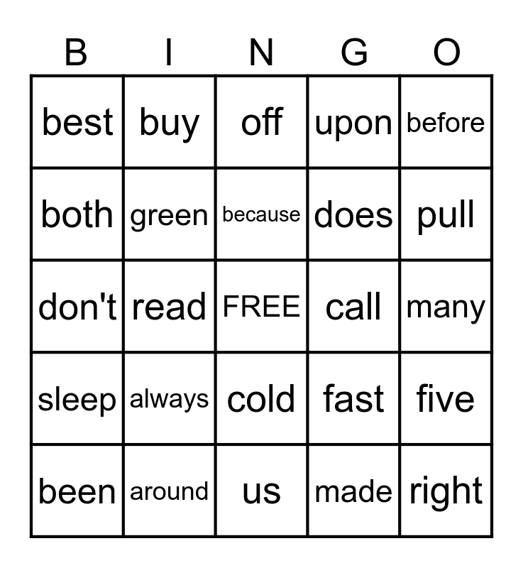 This bingo card has a free space and 24 words: always, around, because, been, before, best, both, buy, call, cold, does, don't, fast, five, green, made, many, off, pull, read, right, sleep, upon and us.