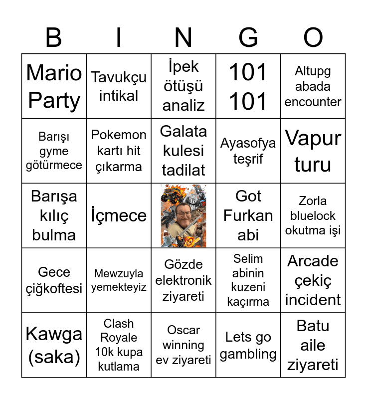 This bingo card has a free space and 24 words: Mewzuyla yemekteyiz, Clash Royale 10k kupa kutlama, Galata kulesi tadilat, Kawga (saka), Altupg abada encounter, Mario Party, Barışı gyme götürmece, Tavukçu intikal, Got Furkan abi, Gözde elektronik ziyareti, Ayasofya teşrif, Barışa kılıç bulma, Selim abinin kuzeni kaçırma, Arcade çekiç incident, Pokemon kartı hit çıkarma, Lets go gambling, Zorla bluelock okutma işi, İpek ötüşü analiz, Vapur turu, İçmece, Batu aile ziyareti, Gece çiğkoftesi, 101 101 and Oscar winning ev ziyareti.