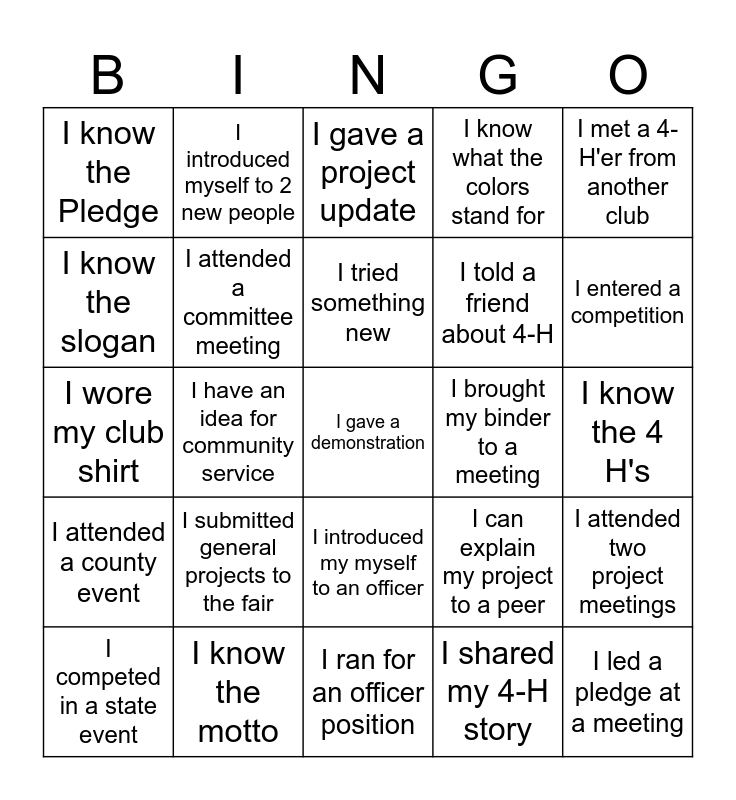 This bingo card has 25 words: I submitted general projects to the fair, I ran for an officer position, I tried something new, I competed in a state event, I met a 4-H'er from another club, I know the Pledge, I know the slogan, I introduced myself to 2 new people, I brought my binder to a meeting, I introduced my myself to an officer, I told a friend about 4-H, I wore my club shirt, I can explain my project to a peer, I attended two project meetings, I attended a committee meeting, I led a pledge at a meeting, I know the 4 H's, I gave a project update, I entered a competition, I have an idea for community service, I gave a demonstration, I know the motto, I attended a county event, I know what the colors stand for and I shared my 4-H story.